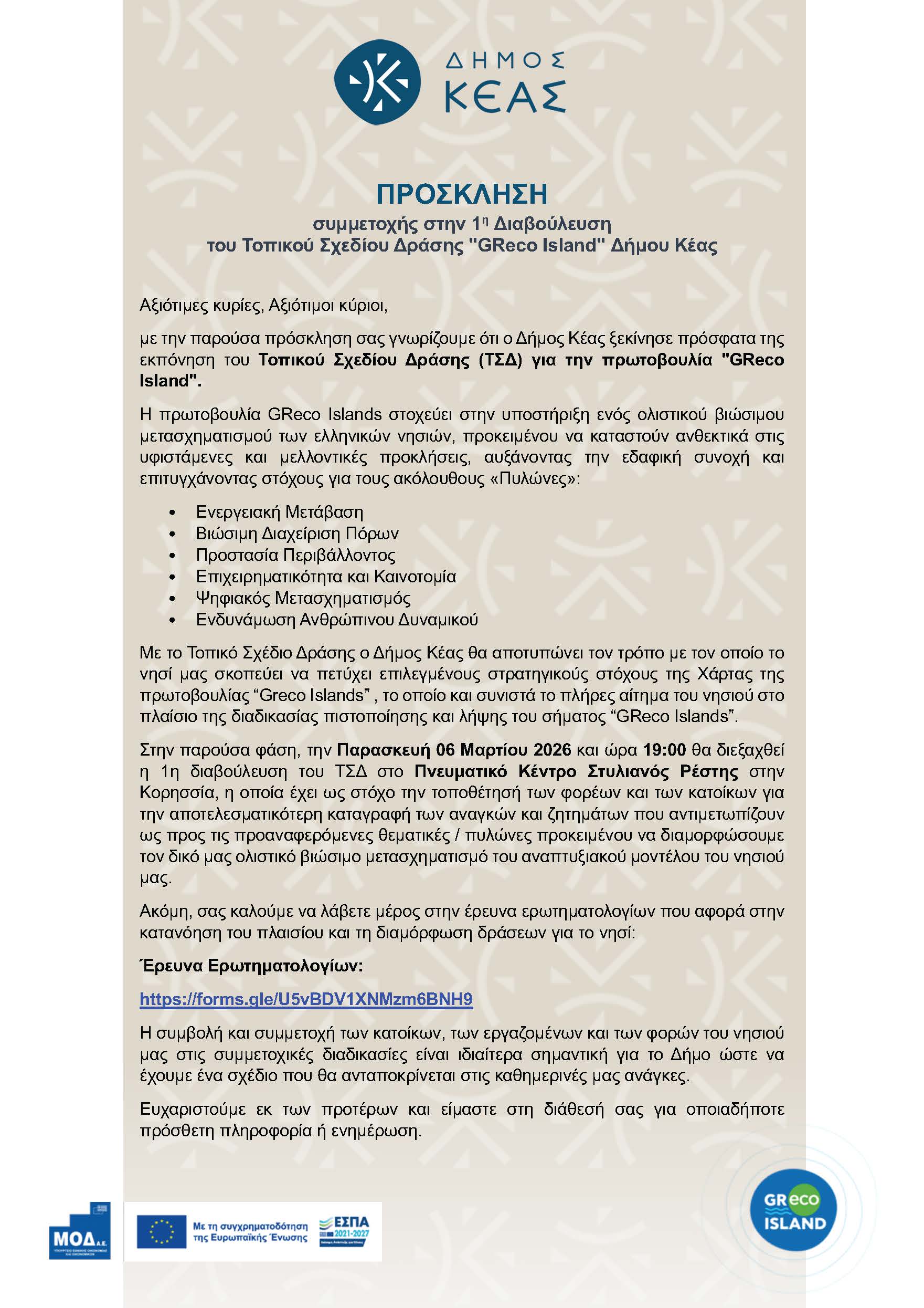 Σας προσκαλούμε να συμμετάσχετε στην 1η Διαβούλευση του Τοπικού Σχεδίου Δράσης “GReco Island” Δήμου Κέας, που θα γίνει την Παρασκευή 6 Μαρτίου 2026 και ώρα 19:00 στο Πνευματικό Κέντρο Στυλιανός Ρέστης στην Κορησσία.