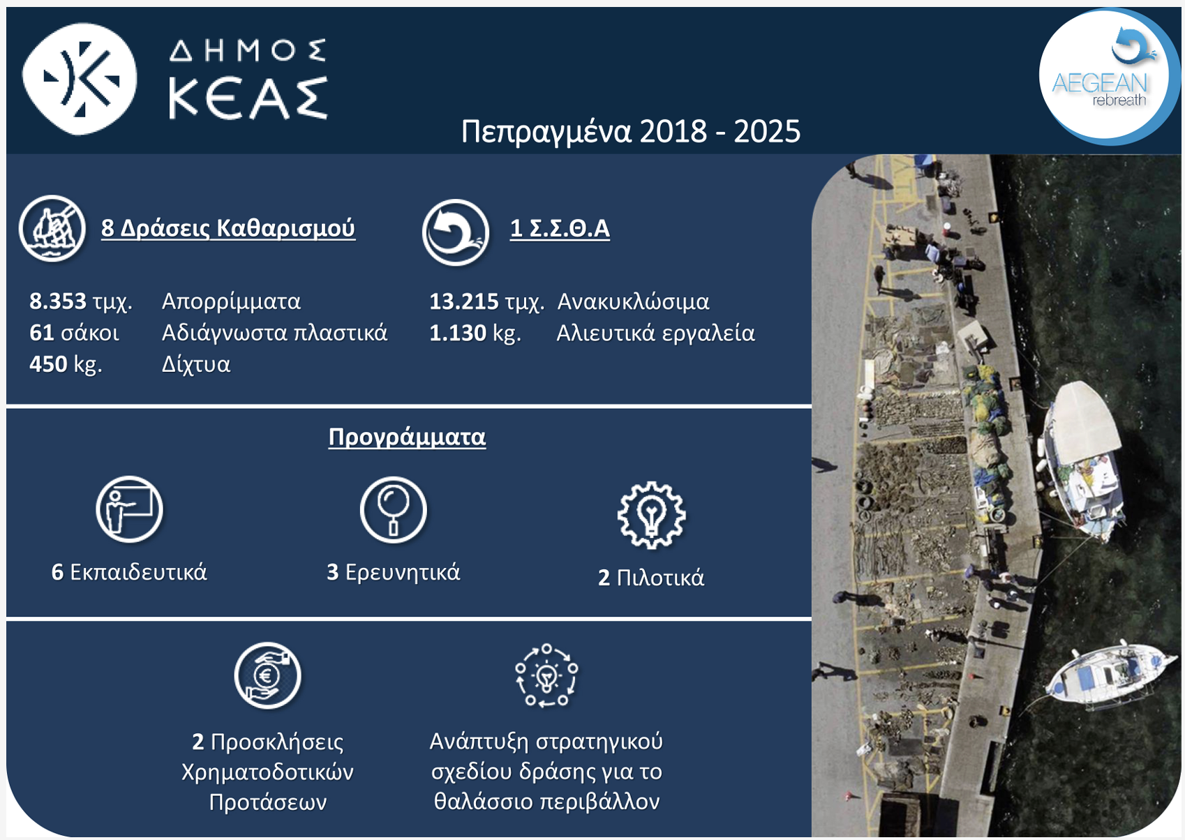 Ο Δήμος της Κέα, με συνέπεια και στρατηγικό σχεδιασμό, συνεχίζει την υλοποίηση ενός ολοκληρωμένου πλαισίου δράσεων για την προστασία του θαλάσσιου περιβάλλοντος. Η περίοδος 2018–2025 αποτυπώνει μια συστηματική προσπάθεια που συνδυάζει καθαρισμούς, επιστημονική τεκμηρίωση, εκπαίδευση και θεσμική θωράκιση.