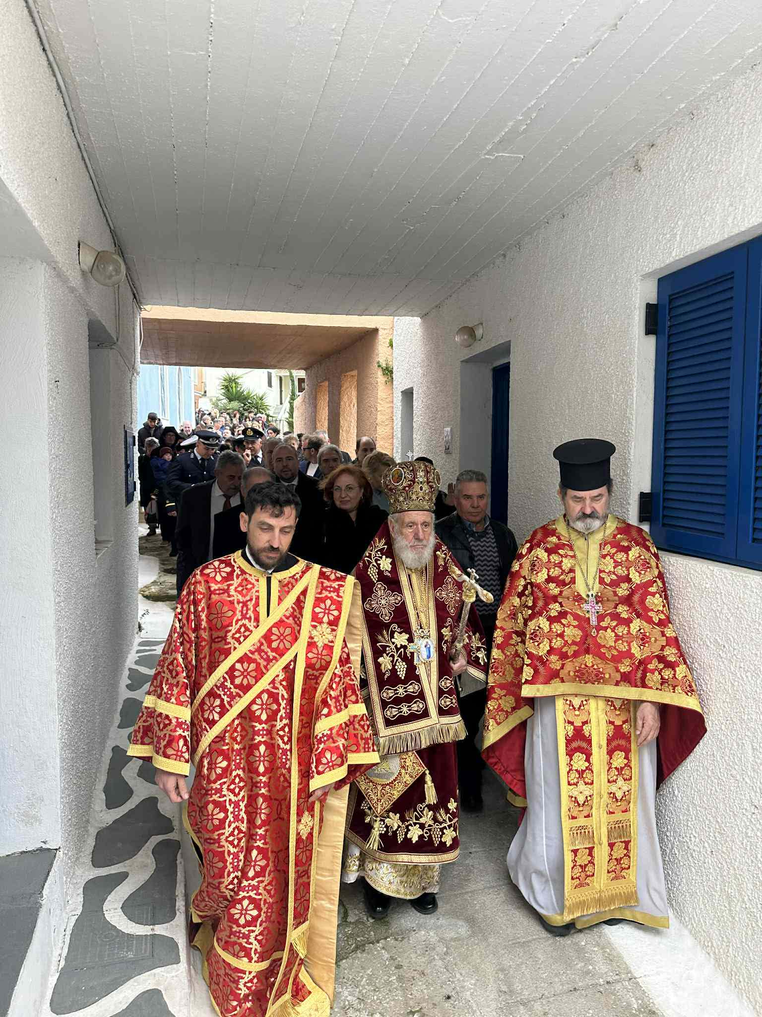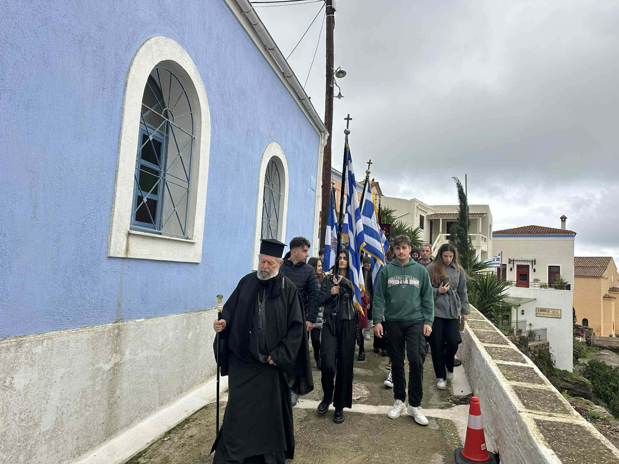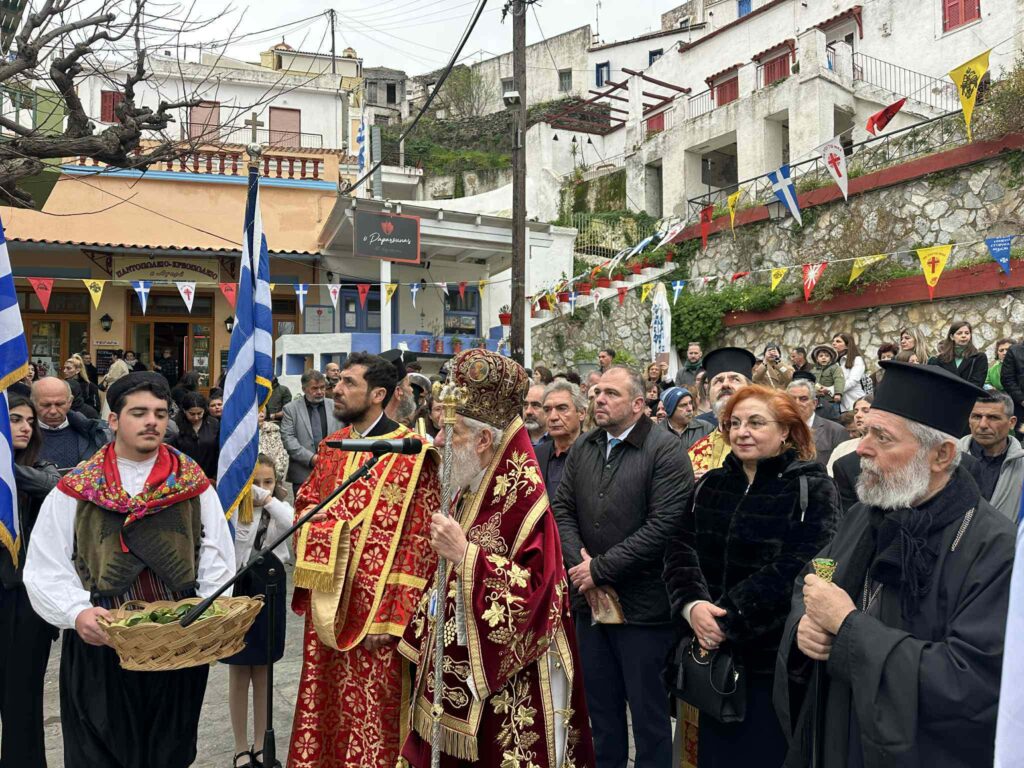 Πανηγυρικές θείες λειτουργίες τελέστηκαν στον Ιερό Ναό Αγίου Χαραλάμπους στην Πιάτσα, καθώς και στη Δημοτικιά (Ιερό Ναό Ευαγγελισμού της Θεοτόκου), χοροστατούντος του Σεβασμιωτάτου Μητροπολίτη κ. Δωροθέου. Οι ναοί γέμισαν από πιστούς, ενώ ξεχωριστή ήταν η παρουσία των μαθητών του νησιού, οι οποίοι συμμετείχαν κρατώντας τις σημαίες των σχολείων τους, προσδίδοντας ιδιαίτερο συμβολισμό στην ημέρα.