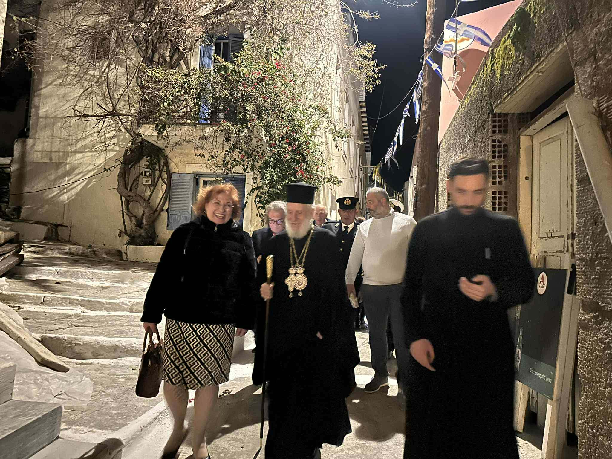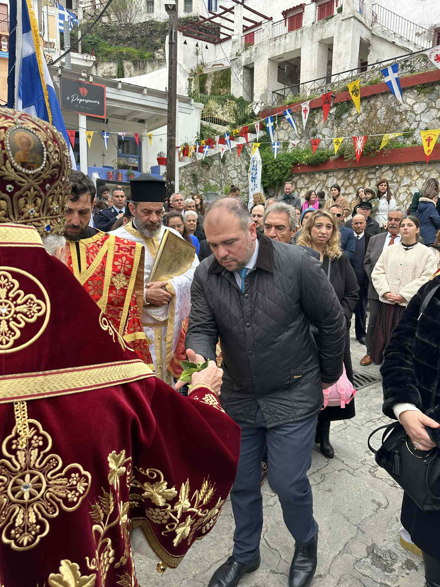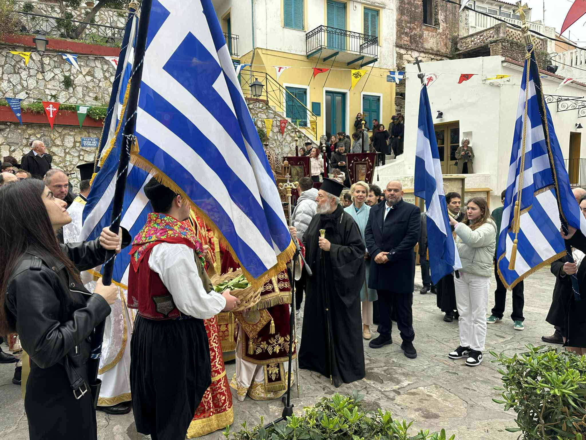 Πανηγυρικές θείες λειτουργίες τελέστηκαν στον Ιερό Ναό Αγίου Χαραλάμπους στην Πιάτσα, καθώς και στη Δημοτικιά (Ιερό Ναό Ευαγγελισμού της Θεοτόκου), χοροστατούντος του Σεβασμιωτάτου Μητροπολίτη κ. Δωροθέου. Οι ναοί γέμισαν από πιστούς, ενώ ξεχωριστή ήταν η παρουσία των μαθητών του νησιού, οι οποίοι συμμετείχαν κρατώντας τις σημαίες των σχολείων τους, προσδίδοντας ιδιαίτερο συμβολισμό στην ημέρα.