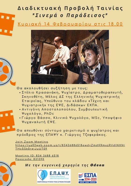 Η Κινητή Μονάδα Ψυχικής Υγείας Δυτικών Κυκλάδων διοργανώνει διαδικτυακή προβολή της ταινίας «Σινεμά ο Παράδεισος», την Κυριακή 14 Φεβρουαρίου στις 18.00.