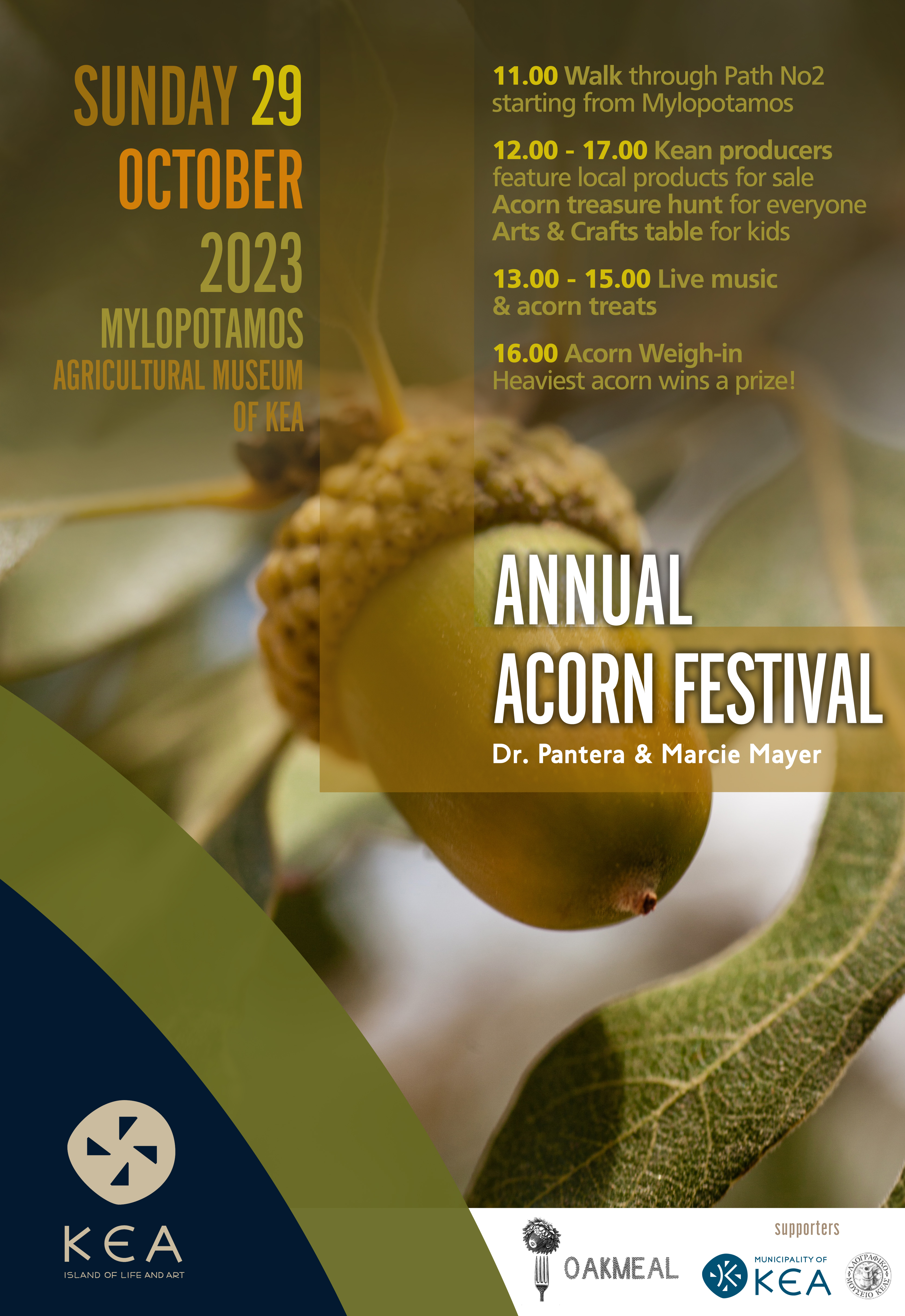 Την Κυριακή 29 Οκτωβρίου 2023 σας περιμένουμε από το πρωί ως το απόγευμα στον Μυλοπόταμο, σε μια ξεχωριστή γιορτή στην οποία θα μάθουμε τα πάντα γύρω από τα βελανίδια, θα γευτούμε λιχουδιές βελανιδιού και θα διασκεδάσουμε.