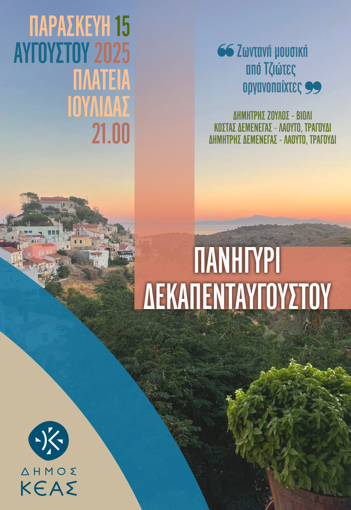 Ο Δεκαπενταύγουστος γιορτάζεται με μεγαλοπρέπεια στην Κέα. Φέτος ο Δήμος Κέας διοργανώνει ξανά το καθιερωμένο γλέντι στην Πλατεία της Ιουλίδας, με ζωντανή μουσική από ντόπιους οργανοπαίχτες και πολύ χορό! Μην το χάσετε!