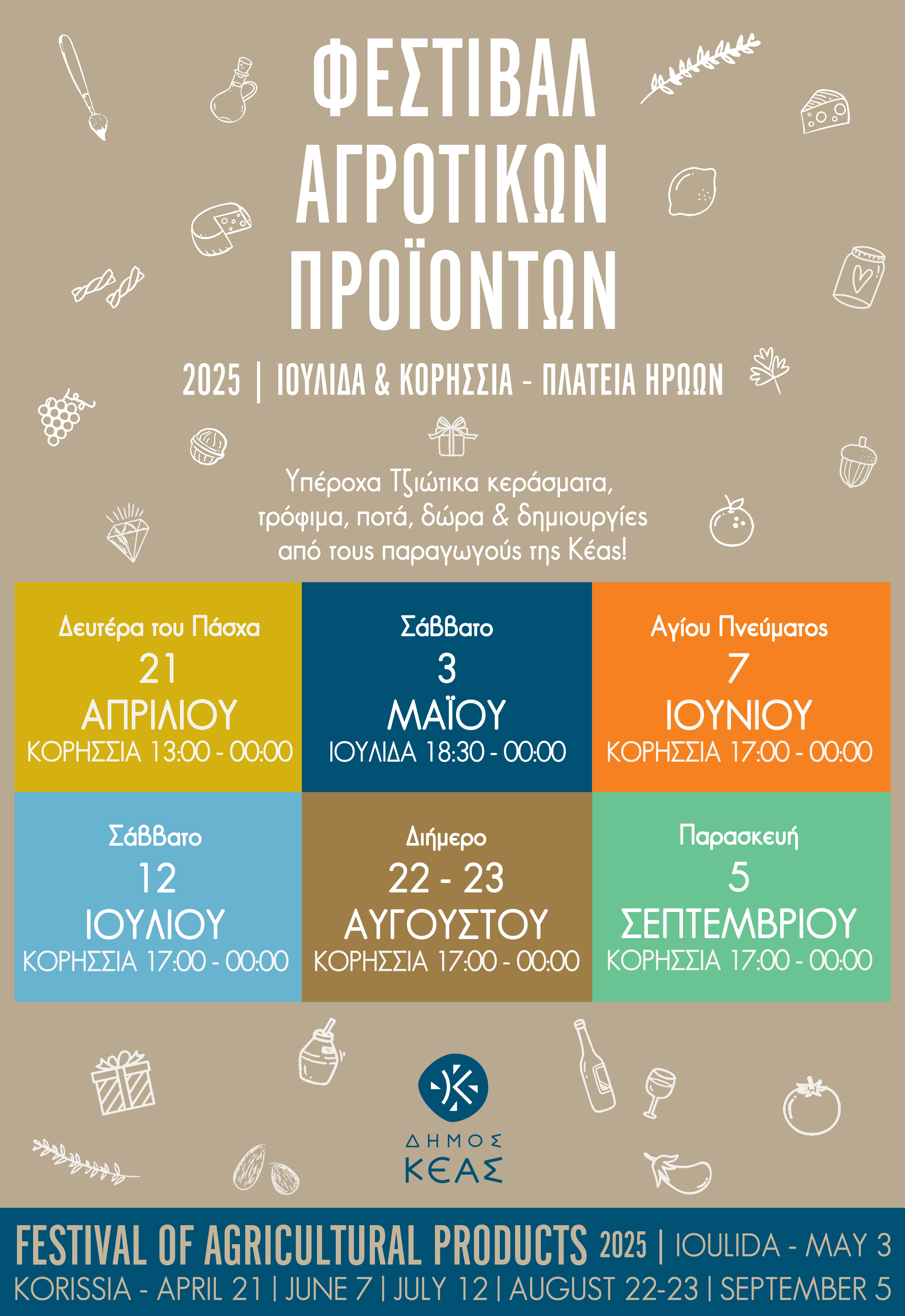 Τη διοργάνωση του Φεστιβάλ Αγροτικών Προϊόντων έχει αναλάβει ο Δήμος Κέας. Είσοδος ελεύθερη!
