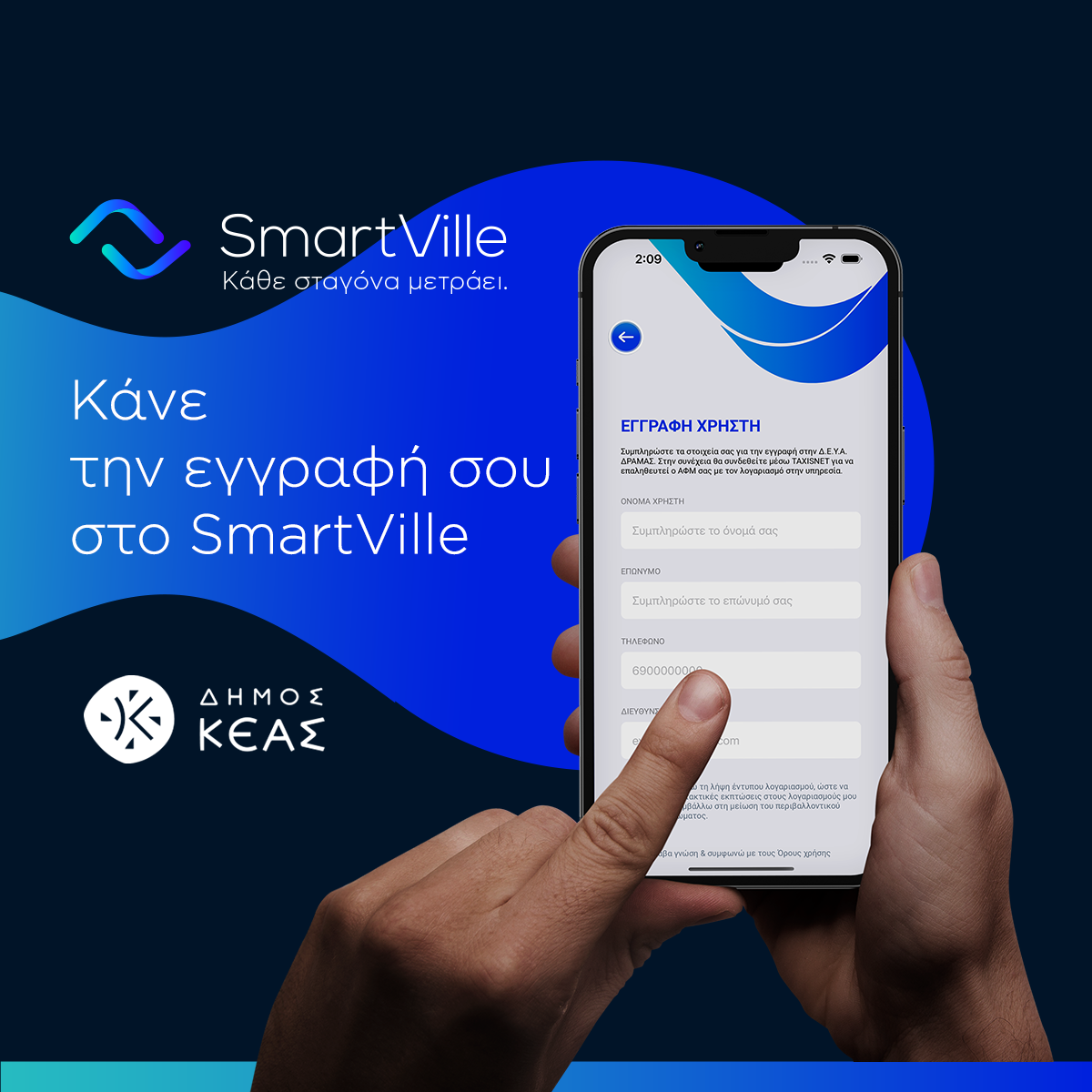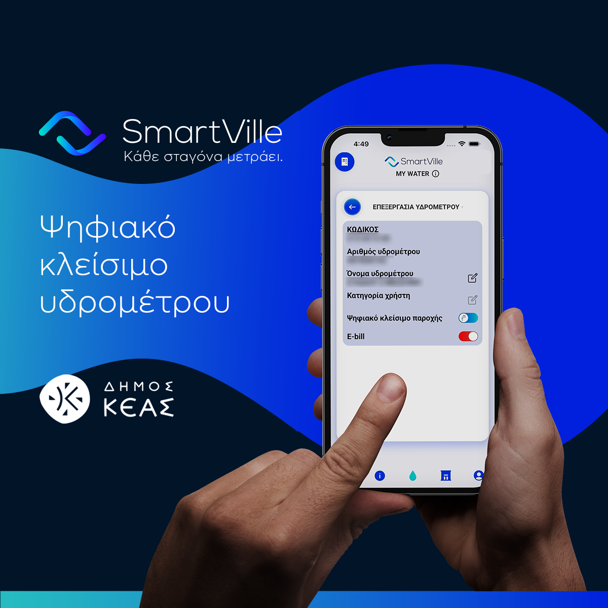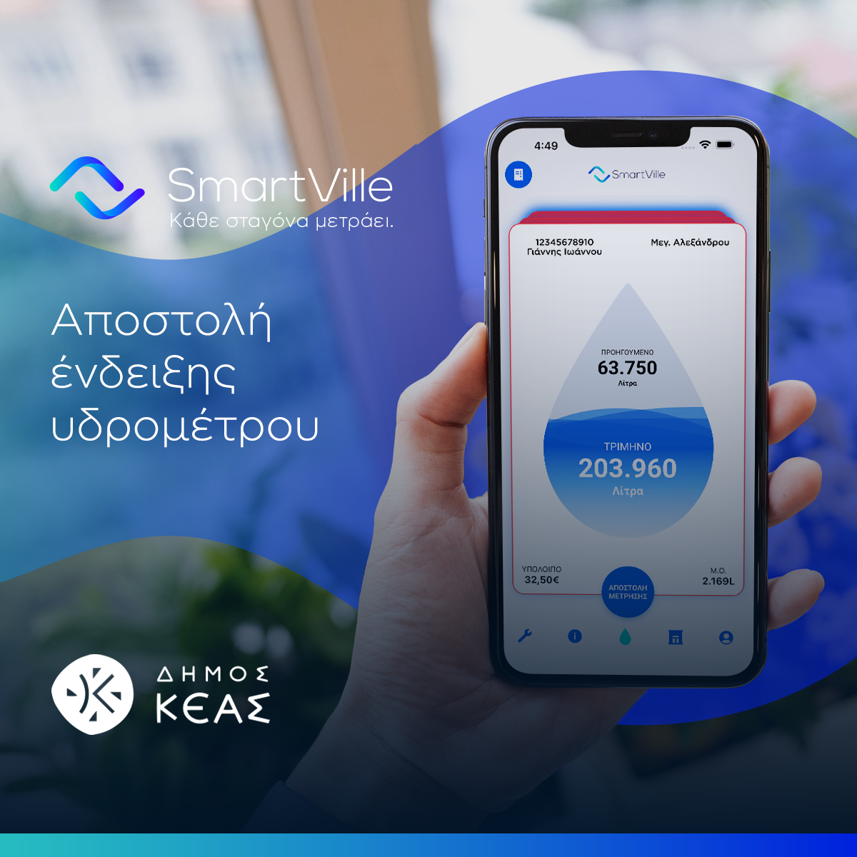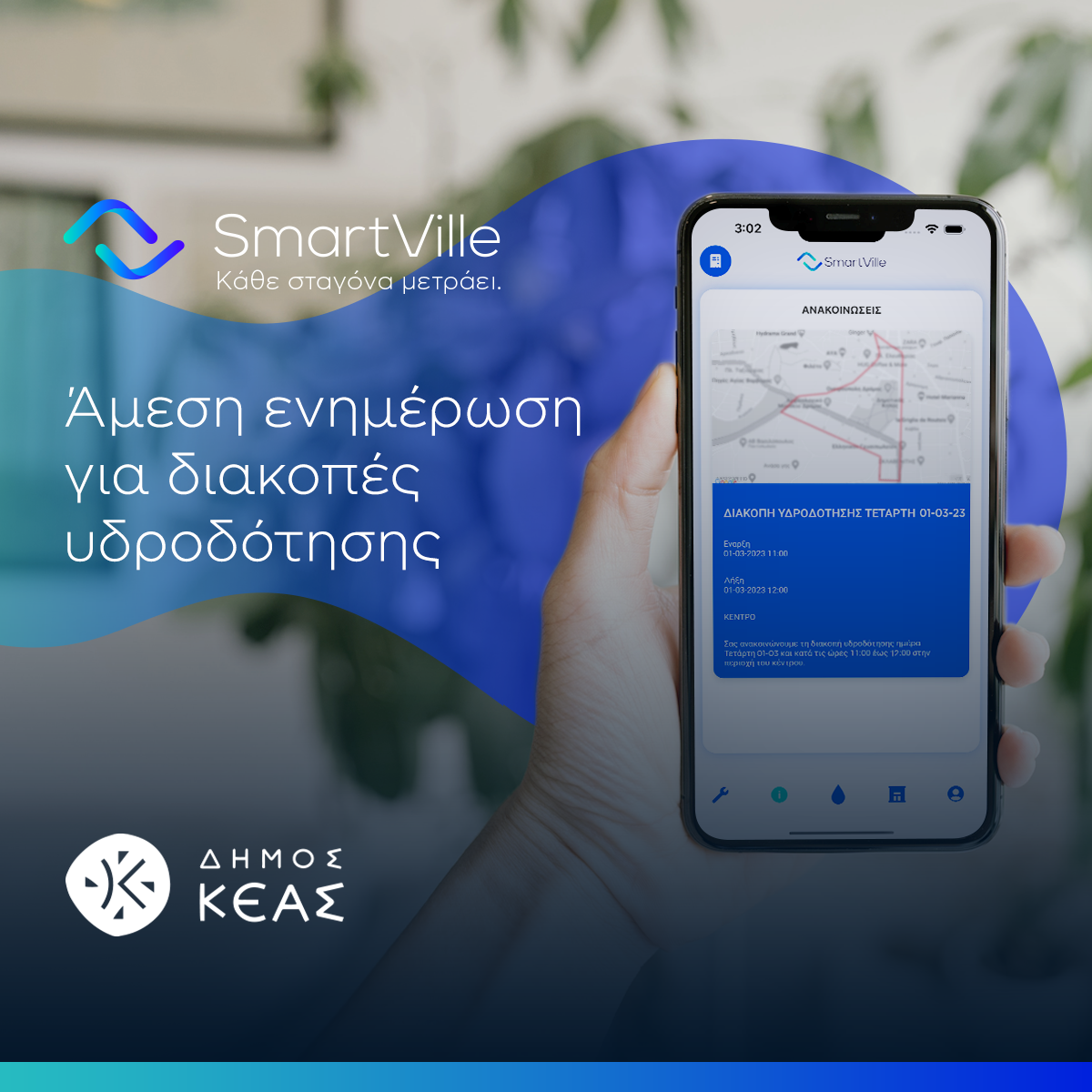 Ο Δήμος Κέας, στο πλαίσιο της βέλτιστης εξυπηρέτησής σας και των δράσεων για την προστασία του περιβάλλοντος, αναβαθμίζει τις υπηρεσίες ύδρευσης, προσφέροντάς τες και ηλεκτρονικά μέσω του My SmartVille.