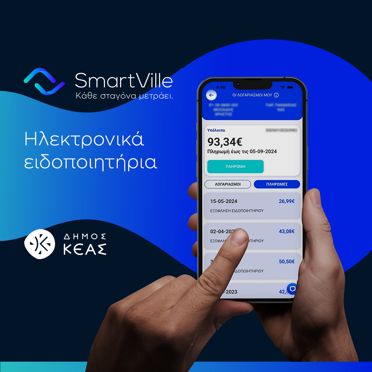 Επίσης, επιλέγοντας μέσω του My SmartVille να μην λαμβάνετε ταχυδρομικώς έντυπα ειδοποιητήρια, προστατεύετε το περιβάλλον, συμβάλλοντας στη μείωση της χρήσης χαρτιού και των ρύπων από τις περιορισμένες μετακινήσεις των διανομέων.