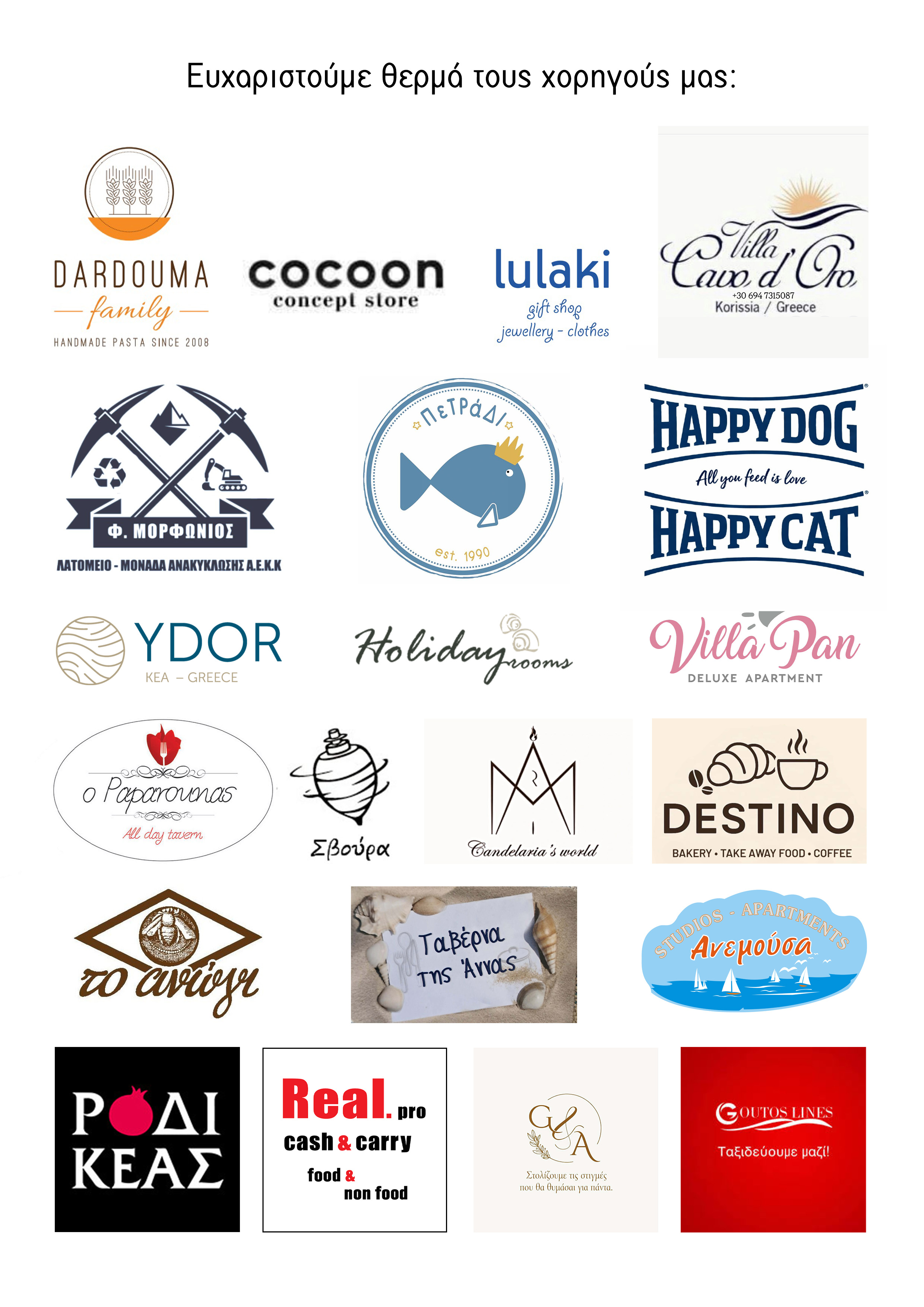 • Τους χορηγούς και υποστηρικτές της διοργάνωσης για την πολύτιμη συμβολή τους και αναλυτικότερα τους φορείς και τις επιχειρήσεις: ΕΟΤ, Γενική Γραμματεία Αθλητισμού, Ελληνικός Ερυθρός Σταυρός, RunNtrail, Εξωραϊστικός Σύλλογος ΚΑΡΘΑΙΑ, Radio Kea, Dardouma Family, Cocoon, Lulaki, Villa Cavo d’Oro, Φ. Μορφωνιός, Πετράδι, Happy Dog Happy Cat, Ydor, Holiday Rooms, Villa Pan, O Paparounas, Svoura, Candelaria’s World, Destino, Το Ανώγι, Ταβέρνα της Άννας, Ανεμούσα, Ρόδι Κέας, Real Pro, G&A, Goutos Lines