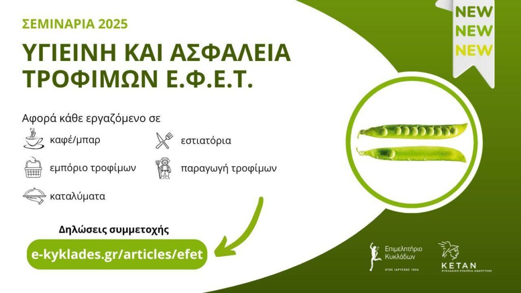 Tο Επιμελητήριο Κυκλάδων ανακοινώνει ότι στις 23 & 24 Ιουνίου θα πραγματοποιηθεί το τελευταίο σεμινάριο Υγιεινής & Ασφάλειας Τροφίμων (Ε.Φ.Ε.Τ.) για το α’ εξάμηνο του 2025.
